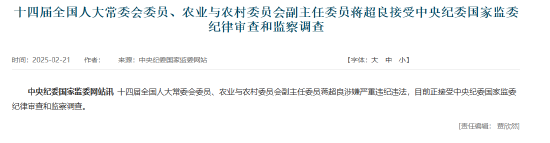 2月21日金融一线消息,中央纪委国家监委网站发布消息,十四届全国人大常委会委员、农业与农村委员会副主任委员蒋超良涉嫌严重违纪违法,目前正接受中央纪委国家监委纪律审查和监察调查。