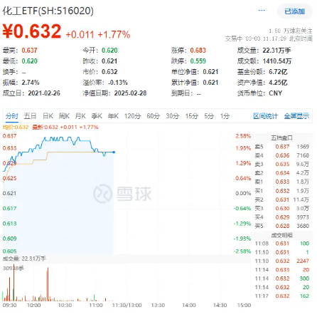 场内热门ETF方面,反映化工板块整体走势的化工ETF(516020)开盘后持续拉升,盘中场内价格最高涨幅达到2.58%,后略有回落,截至11:17,涨1.77%。