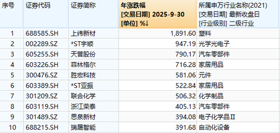 前三季度,以1891.60%的巨大涨幅居首位,排名第二到第十的依次是*ST宇顺、天普股份、、、*ST亚振、、、、,涨幅均超390%。
