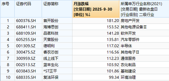 个股方面,9月涨幅排名前十股票依次是首开股份、海博思创、品茗科技、天普股份、德明利、香农芯创、线上线下、蓝丰生化、*ST正平、复洁环保。其中,前9只股票单月股价完成翻倍。