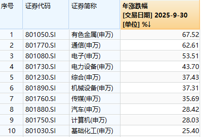 前三季度,有色金属行业与通信行业分别累计上涨67.52%和62.61%,分列前两位。电子行业累计涨幅53.51%,电力设备行业涨幅43.70%,综合、机械设备、传媒行业累计涨幅均超30%。