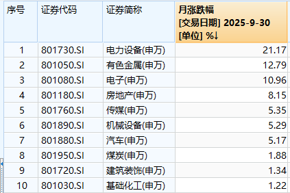 以申万一级行业划分,电力设备行业单月上涨21.17%,涨幅领先。有色金属、电子行业单月涨幅超过10%,房地产、传媒、机械设备、汽车行业涨幅超过5%。