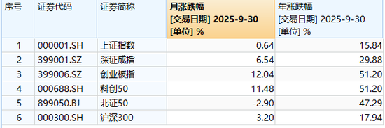 Wind数据显示,截至9月30日收盘,上证指数报3882.78点,单月上涨0.64%;深证成指报13526.51点,单月上涨6.54%;创业板指报3238.16点,单月上涨12.04%。