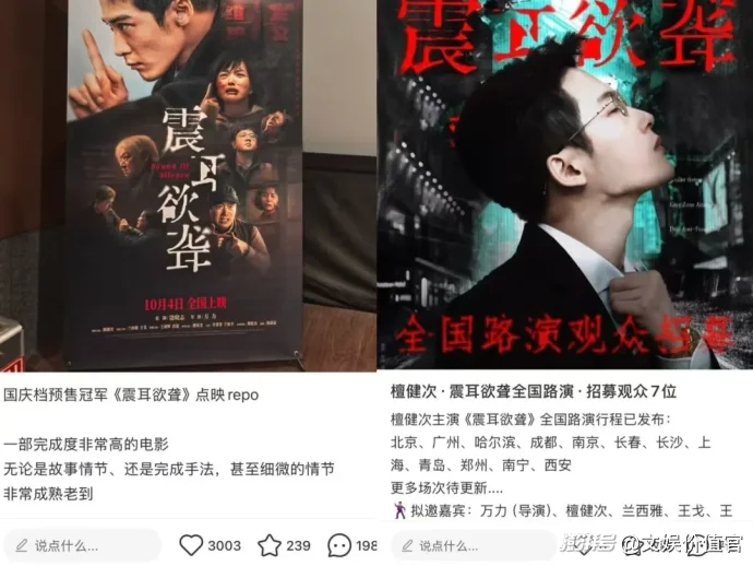其次,粉丝对于预售乃至票房的拉动作用越来越突显。在预售开启前,业内普遍对《刺杀小说家2》《志愿军:浴血和平》最为看好,但《震耳欲聋》最后却弯道超车,粉丝发起的组合式营销功对推高影片口碑功不可没,最终,这些口碑和流量又明显拉动预售数据“有效转化”。