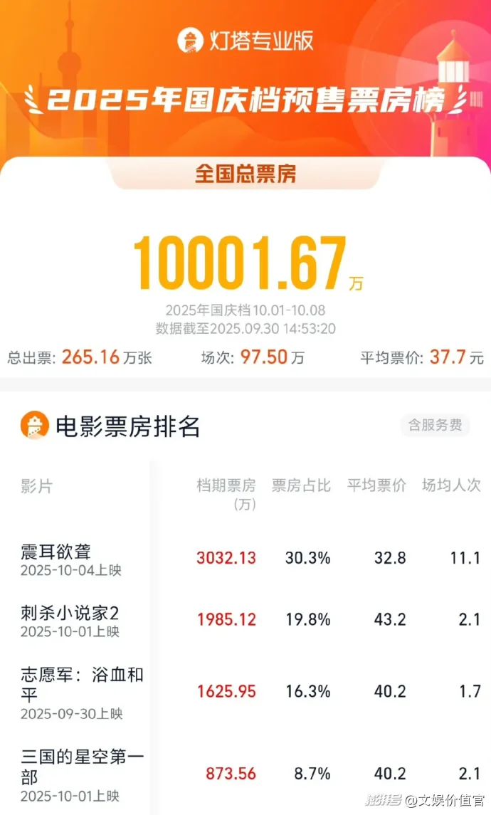具体来看,预售期表现最强的影片是檀健次主演的反诈题材电影《震耳欲聋》,开启预售不到24小时即突破1000万,截至9月30日14:53,预售票房达3032万,稳居国庆档新片预售榜首位。