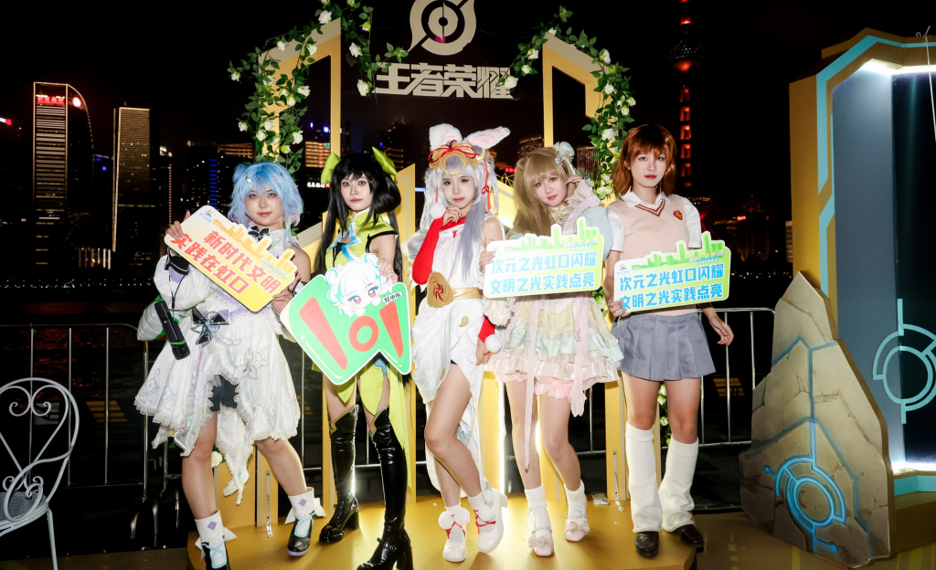 国产游戏IP《王者荣耀》《崩坏:星穹铁道》从游戏角色、背景出发,结合北外滩地标、时令元素等,带给观众耳目一新的体验。