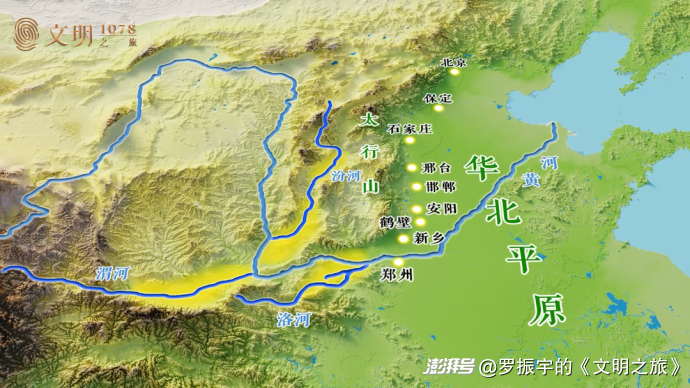 中华文明最早的发源地,其实不是在平原,而是在渭河谷地、汾河谷地、洛河谷地,就是黄河中游的几个支流的沿岸。再后来才发展到太行山以东。但是请注意,刚开始只是沿着太行山东麓的山坡发展,基本上就是今天京广线经过的那些城市:保定、石家庄、邢台、邯郸、安阳、鹤壁、新乡、郑州,就在这一带的太行山的山根儿,根本就不往华北平原的腹地去。