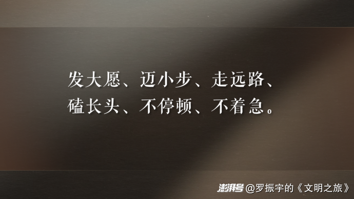 我在策划这个《文明之旅》节目的时候,就写了几个词和我的同事共勉:“发大愿、迈小步、走远路、磕长头、不停顿、不着急。”这几个词,不是谁的发明,这不过是我们祖先的精神在我们这代人的生命中的回响。