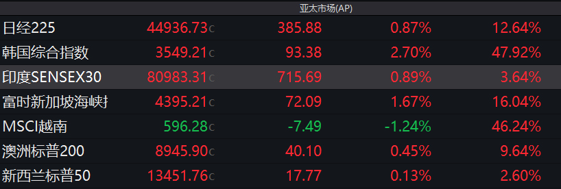 不仅是港股市场,周四亚太主要股指也全线上涨。Wind数据显示,截至10月2日收盘,日经225指数收盘涨0.87%,报44936.73点。韩国综合指数涨2.7%,报3549.21点,创收盘纪录新高。澳洲标普200指数收盘涨0.45%,报8945.90点。新西兰标普50指数收盘涨0.13%,报13451.76点。