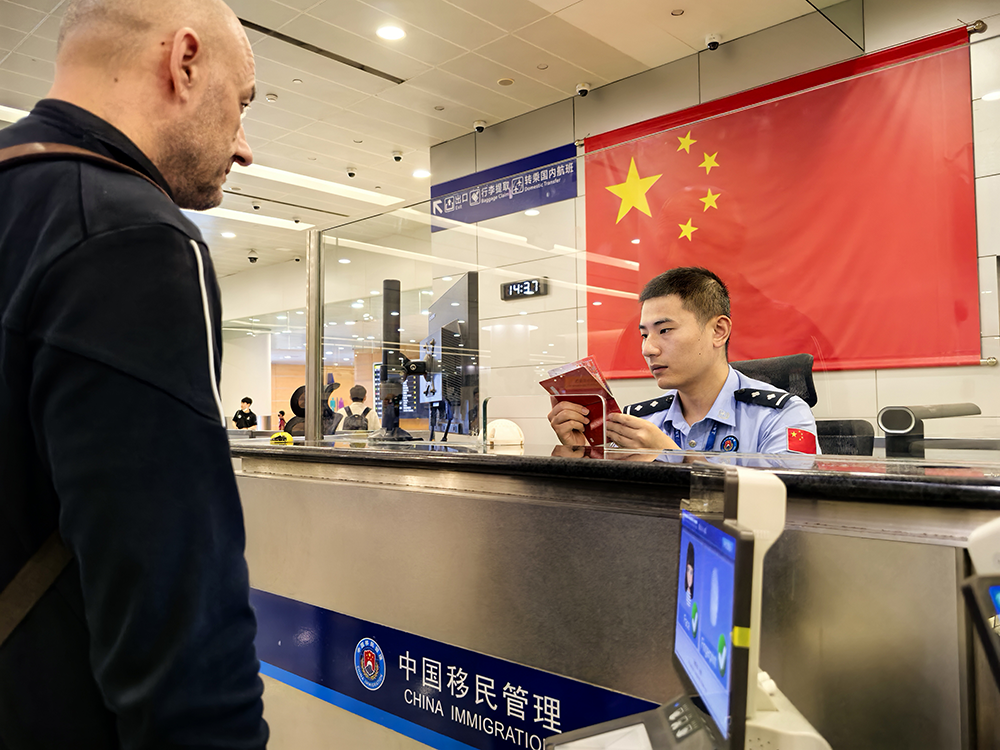 移民管理警察为旅客办理边检手续。魏文亨 摄