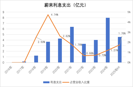 从2016年到2025年Q2,蔚来利息支出经历了两个阶段的攀升。