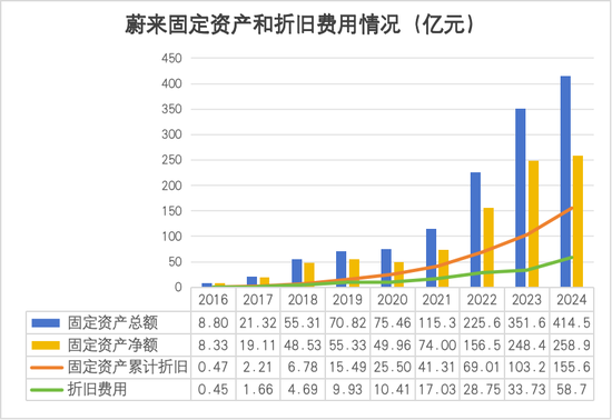 根据年报披露,蔚来固定资产总额逐年攀升,折旧费用也水涨船高,从2019年的9.93亿元攀升至2024年的58.7亿元,累计增幅高达491.14%,2019~2024年间累计折旧费用超过158亿元,占销售收入的7.6%。重资产投入产生的长期折旧费用,将持续影响利润,且折旧费用属于固定成本,如果未来蔚来销量发生波动,折旧费用将进一步侵蚀利润。