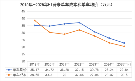 2021~2022年,全球锂、钴、镍等原材料价格暴涨,碳酸锂价格从2020年的4.56万元/吨飙升至2022年的48.21万元/吨,直接推高电池包成本,导致蔚来单车成本从2020年的30.31万元上升至2022年的32.06万元,上升约1.75万元。2023年以后,碳酸锂价格虽一路暴跌,但蔚来单车成本的下降幅度不及单车均价的降幅。2022年至2025年H1,蔚来单车成本下降约11.56万元,单车均价下降约14.31万元。
