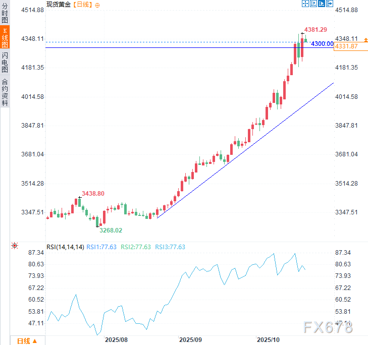 周二(10月21日),现货黄金从前一交易日创下的历史高点附近小幅回落,跌幅约0.8%,但在积极的基本面背景下,任何实质性下跌空间仍显有限。