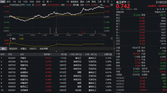 成份股方面,氟化工、石化、钾肥等板块部分个股涨幅居前。截至收盘,飙涨8.91%,、、大涨超5%,、、等多股跟涨超4%。