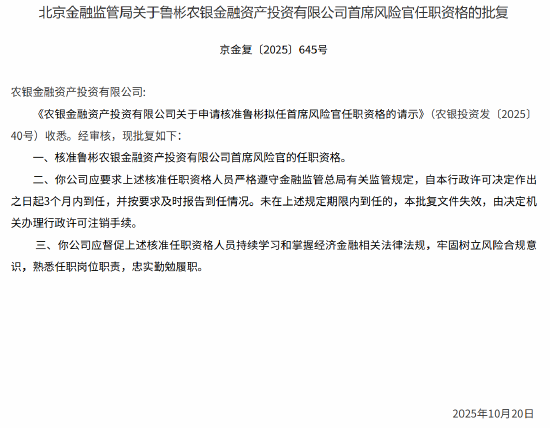 。同时,核准鲁彬农银金融资产投资有限公司首席风险官