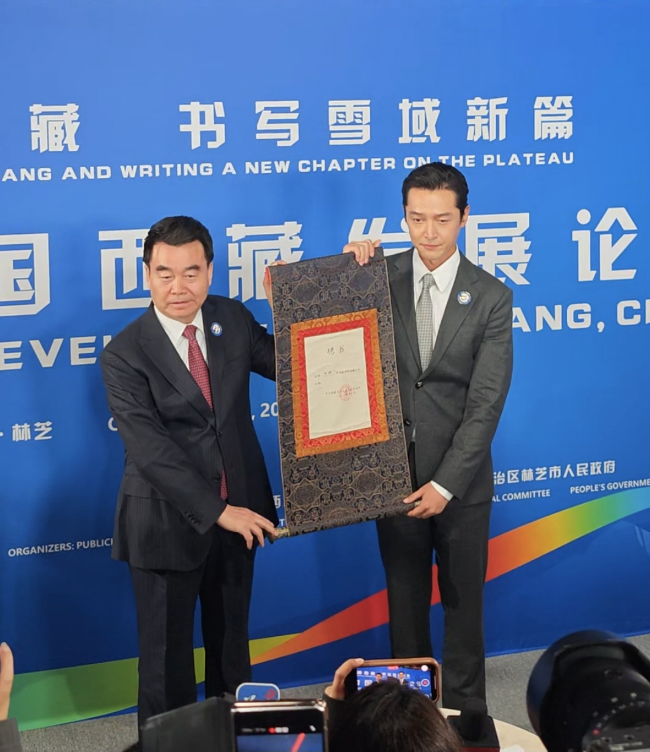 西藏自治区党委常委、宣传部部长汪海洲向胡歌颁授“西藏国际传播大使”聘书