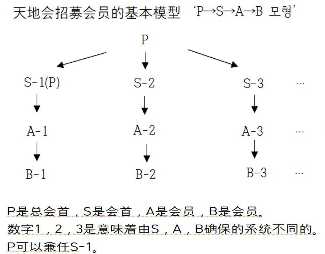 天地会加盟会员的基本模式如下:P是总会首,第一次提出要组织天地会的人就是P。S1、S2、S3这些人,一般是P的亲信,并为P招募至天地会中,这些人大概有5到6个。接着S1、S2、S3等,分别招募A1、A2、A3等人。A1等人再持续招募新人,如此累积。