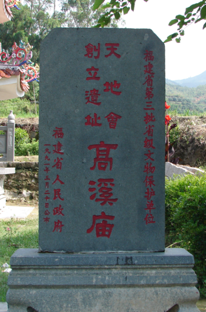 与南少林寺相关的天地会最初起源地,一在福建东边,一在福建西边。那时,我坐了两天大巴,从福建东边到了西边,朝着漳州方向行进。到漳州后,我便开始前往天地会的发源地——高溪庙。福建省人民政府在1991年认定这个地方为天地会创建地。我进去后发现相关资料很少,于是又问了几句:“这个地方真的是天地会起源地吗?”工作人员说:“对对对。”我又问:“有没有证据?”他说:“有证据。”我问:“在哪啊?”他说起源传说里有一个刻有“反清复明”字样的白石香炉,但此香炉为其他寺庙抢走,现已不在高溪庙中。