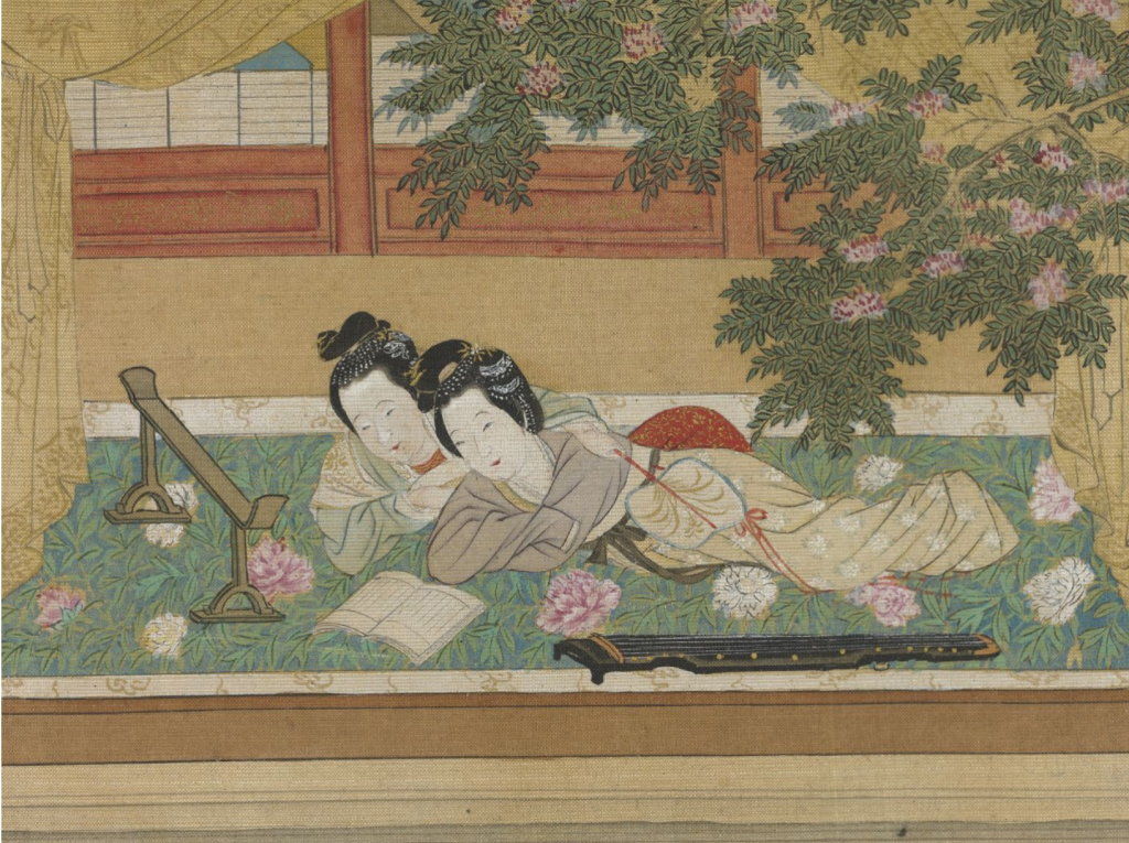 图八:4 清冷枚《春闺倦读图》轴(局部)