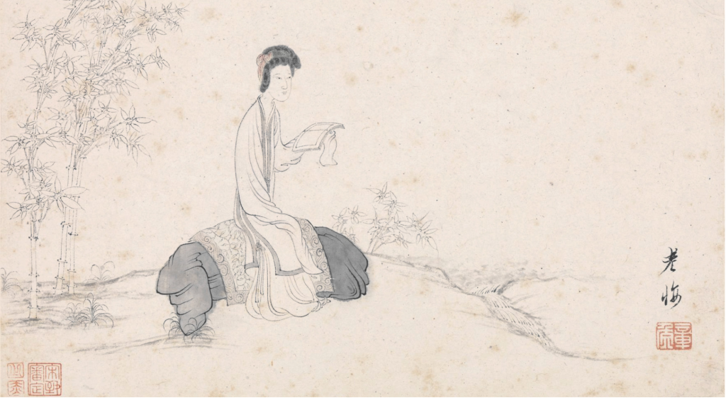 “佳人读书图”在明末清初达到高峰,作者除商业画家外也包括陈洪绶这样的名家。虽然“双人共阅”的构图仍然延续,但单人式样成为无可争辩的主流。画中女子都手执书卷,有的沉浸于专心阅读,有的则出神冥想,将目光从书页上移开。陈洪绶《隐居十六观》册中的“缥香”是属于后一模式的佳作〔图三〕。这帧清淡素雅的小幅水墨画描绘一位坐在秀石之上的闺秀,背后数杆修竹衬托出她的挺直身姿。她手擎书卷,但从书页上抬起双目,直直地凝视远方,似乎思绪已被书中文句带走。