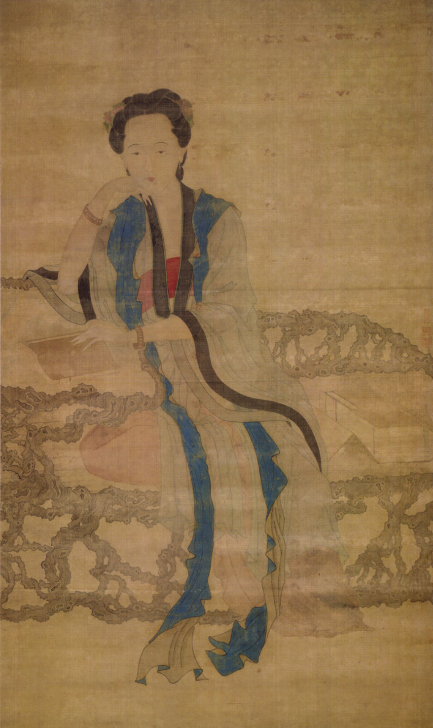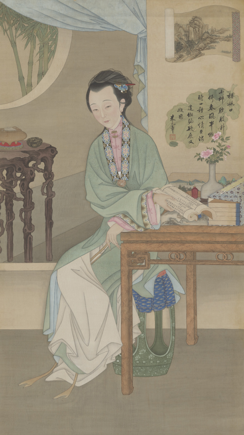 但与其他两画相比,《闺秀诗评图》轴也显示出两个重要的不同之处,透露出其创作时间相对较早。一是对环境的描绘:画家沿循着传统肖像画的常规,以空白背景衬托主体人物,而没有像另两幅画那样,跟随欧洲模式绘出三维室内空间。另一不同点是女子所读的书籍:虽然也是女性诗集,此画所绘之书是《闺秀诗评》,其他两画则是《名媛诗归》。为何发生这一变化?