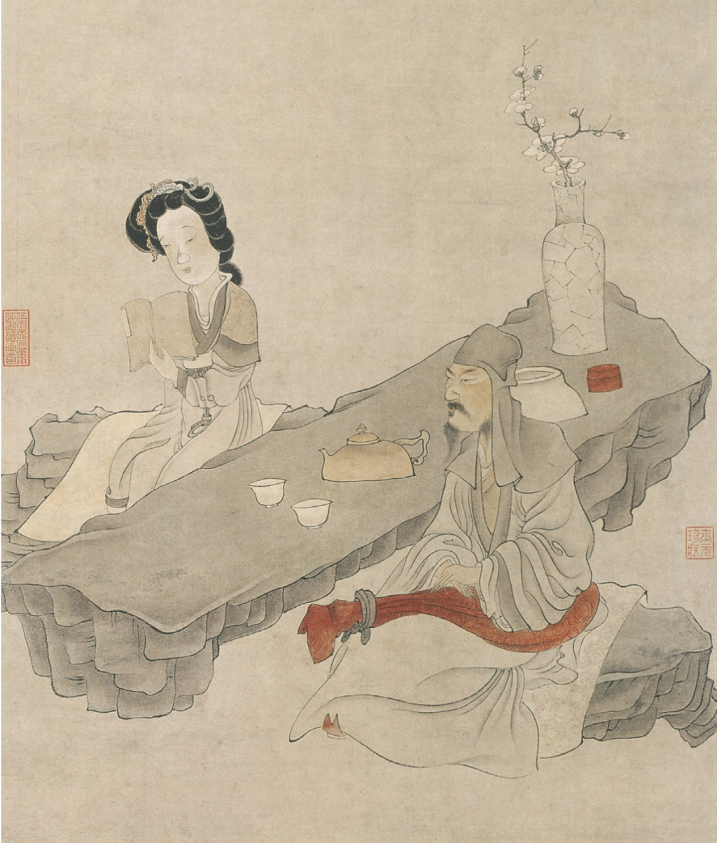 李渔描写的场景出现在陈洪绶的一幅画作里〔图五〕。其画题《闲话宫事图》为后人所加,认为此画描绘的是东汉末年音乐家伶元与其妾樊氏共谈宫廷往事的情景。这个解读很可能是正确的,但如果就画论画的话,它表现的是一名男士沉默地观望着面前的读书女性,后者犹如从一幅佳人读书图中移来,成为此画中被观赏的对象。