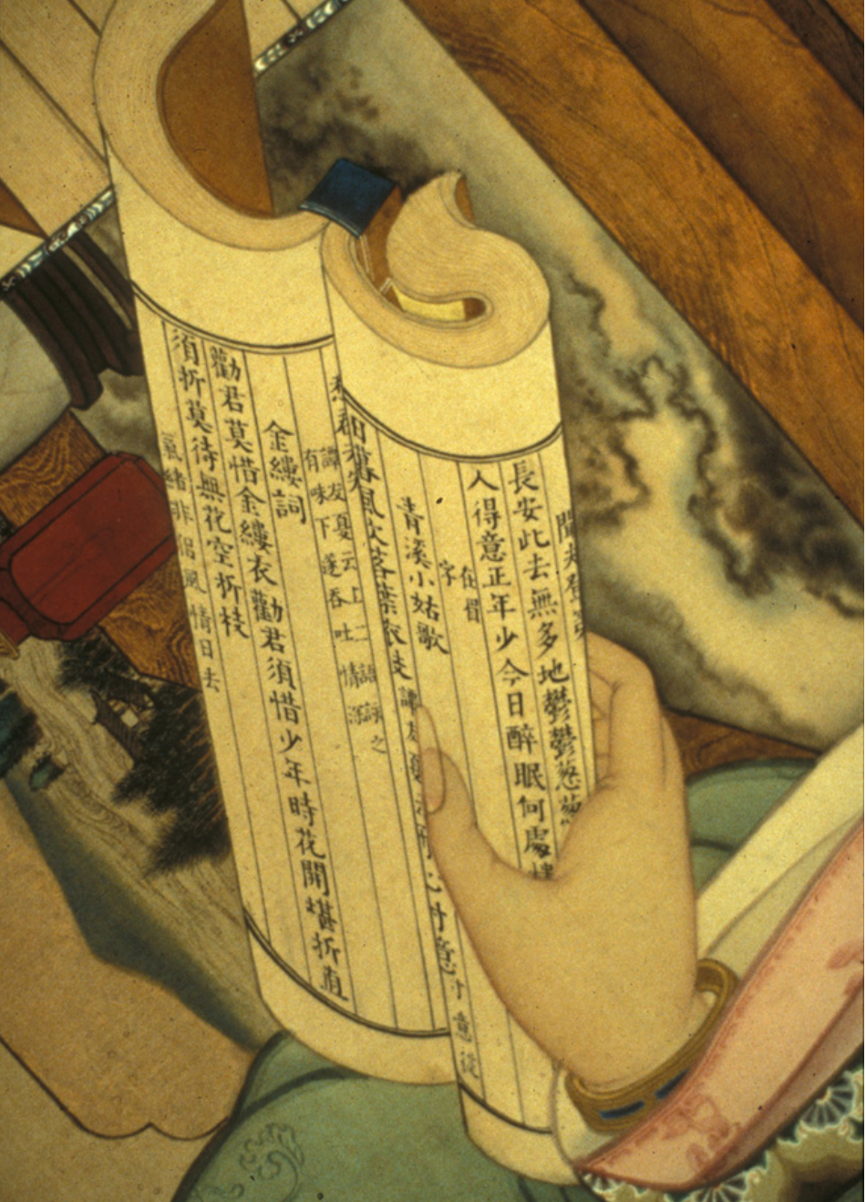 如同陈洪绶册页和冷枚款《仕女图》所示〔见图三,图四〕,这张画中的女子也把目光从手中书卷上移开,恍惚的面部表情透露出微妙的内心活动。但她拿着的书不再无字,而是清晰地显示出书页上的内容。当我在20世纪90年代初开始研究这幅画的时候,我很想知道她所读的是什么书,但当时还没有高清图像发表,直到1993年在故宫博物院看到原画时,才了解到画中美人翻开的书页上载有三首诗,分别是右页上的《闻夫登第》和《青溪小姑歌》,以及左页上的《金缕词》〔图六:3〕。前两首诗或被女子的手指部分遮挡,或位于两页夹缝之间,只有唐代歌姬杜秋娘作的《金缕词》被完整显现,词曰:“劝君莫惜金缕衣,劝君须惜少年时。花开堪折直须折,莫待无花空折枝。”虽然有人认为此诗有励志之意,但它历来被作为情诗看待,如杜牧在《杜秋娘诗并序》中将其与杜氏被唐宪宗宠幸之事相联;清人沈德潜在《唐诗别裁》中称其”词气明艳,近于情语”。笔者因此提出这幅画所表现的,是画中女子因读此诗而思念起不在场的情郎。