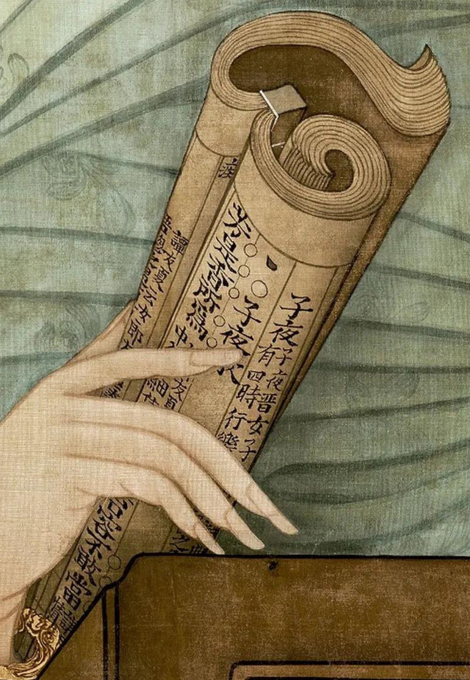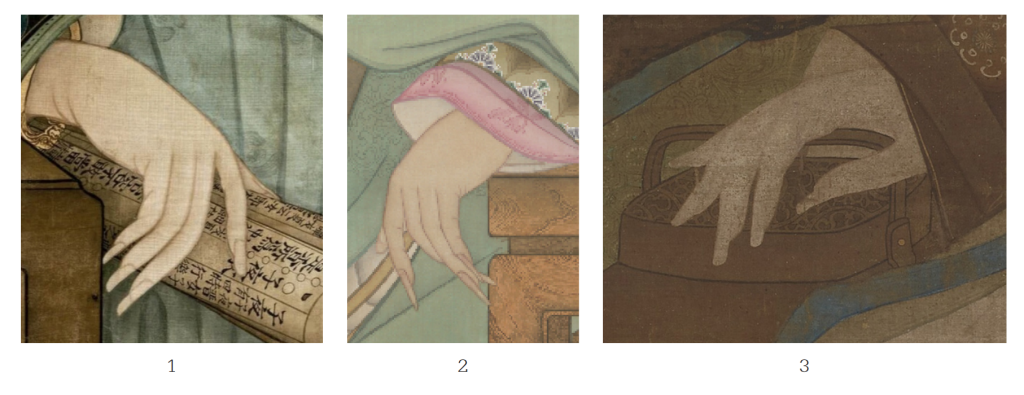 图十三 三画中女子的手1.《春闺倦读图》 2.《美人展书图》 3.《闺秀诗评图》