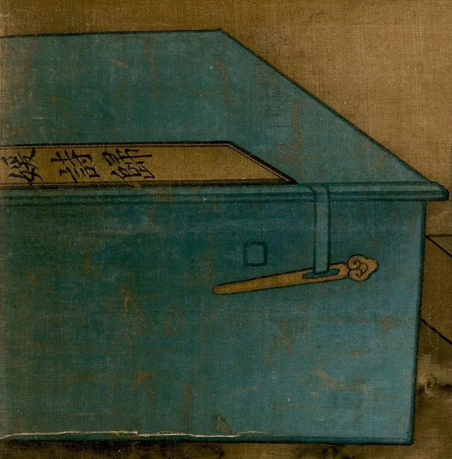 从画幅结构看,《美人展书图》轴纵184.6 厘米,横97.7厘米;《春闺倦读图》轴纵175厘米,宽104厘米,都属于明清仕女画中尺寸最大的一类。而在构图方面,画家把人物置于前景,占据了五分之三至五分之四的画面高度。在描绘室内空间时,两画都采用了从欧洲引入的透视画法(即“线法”),地面和方桌、高几等家具都以40-45度的角度向内延伸〔图十〕;为了强调空间的深邃,《美人展书图》特意在读书女子身后布置出一个隔间,掀起的门帘和墙上的圆窗进而显示出空间的递进。