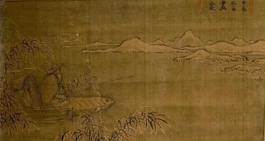 这幅画的另一重要特点,是画家把题款隐于一幅“画中画”里。这是后壁上的一幅《寒江独钓图》贴落,描绘冬日江边苇丛中,披着蓑衣的渔夫坐在小舟之上〔图八:4〕。画幅右上方题有“甲辰冬日画,冷枚”七字,既是这幅画中画的落款,又是整幅《春闺倦读图》的署名。“甲辰”为清雍正二年(1724)。