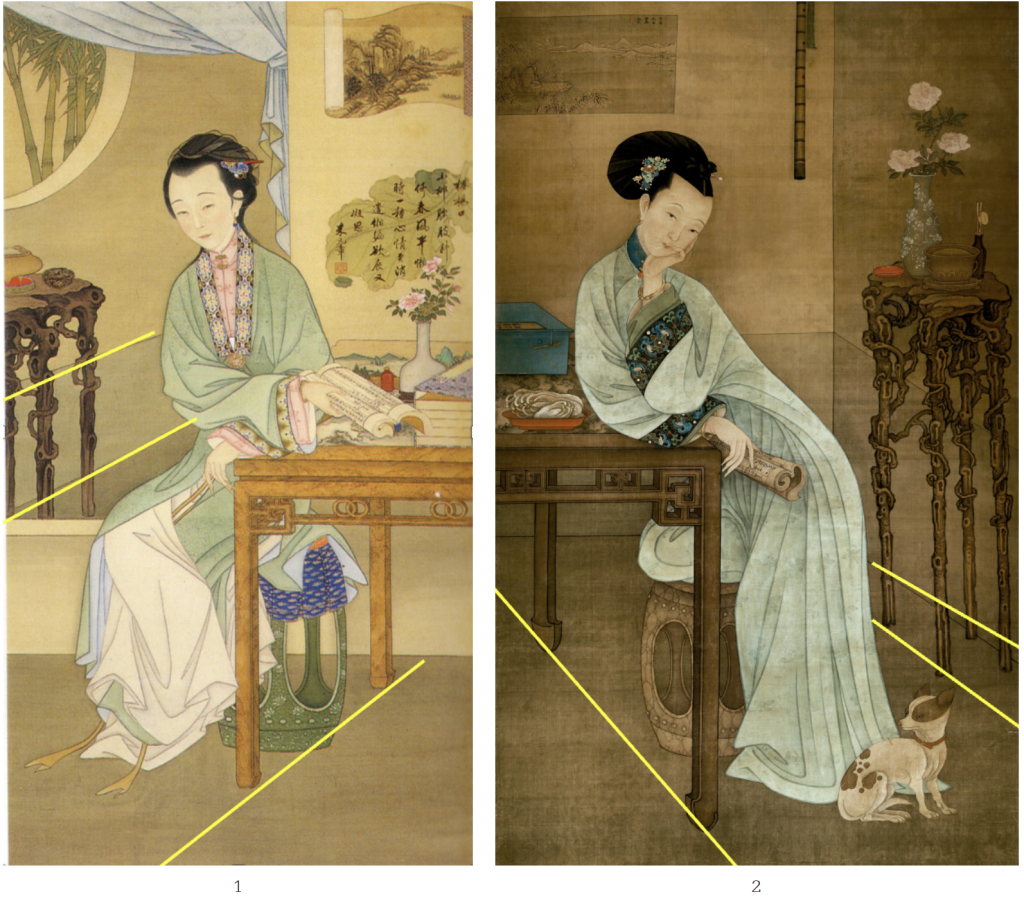 图十 透视角度比较1.《美人展书图》 2.《春闺倦读图》