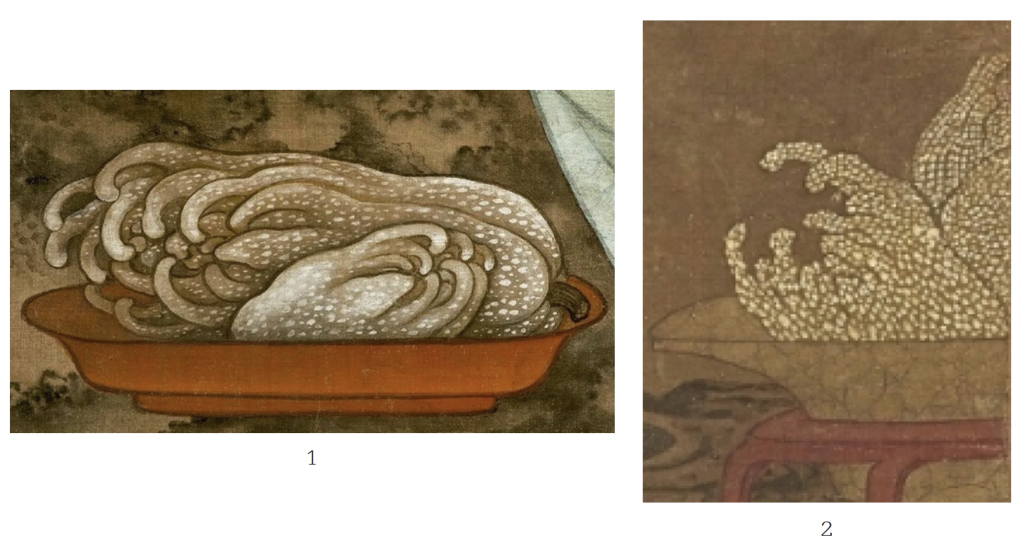 转到《闺秀诗评图》轴(见图九:1),其主题、人物尺度以及对家具和物件的选择,也都与上两幅画相当接近——仕女在画中占据相同比例,也在阅读一本女性诗集,榻边同样放着一个圆形鼓凳。从绘画风格看,榻上的佛手柑不但见于《春闺倦读图》中,而且使用了类似的密集白点表现果皮的质感〔图十一〕。