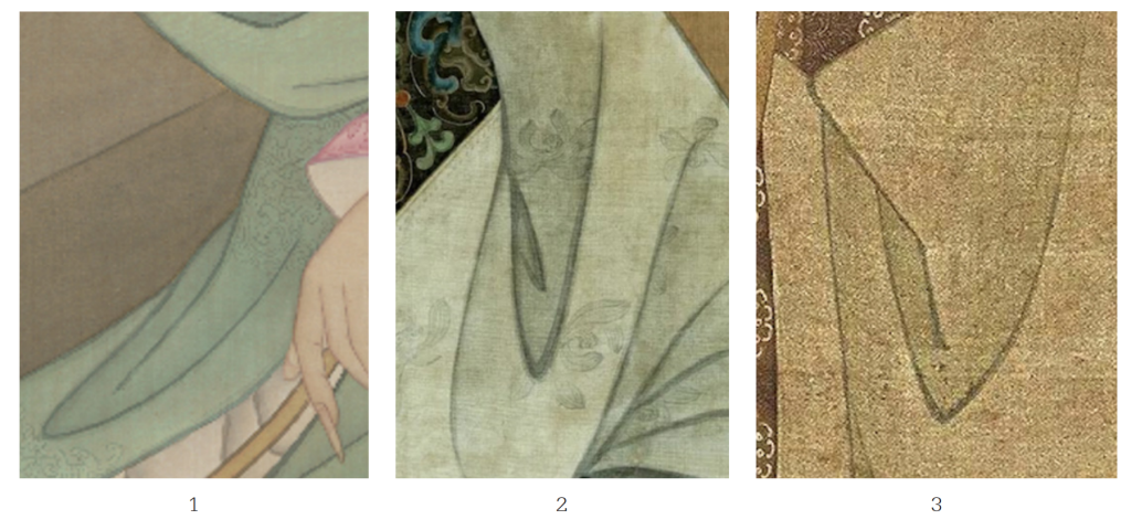 总体来看,三幅画都包括了造型奇特的瘿木家具,以强烈的明暗对比显示出凹凸的表面和透空的形状,似乎画家希望以此显示表现立体感的能力〔图十二〕。三画对仕女手部的描绘也很相似,都在显要的位置上突现出纤纤玉指的优雅轮廓〔图十三〕。衣衫的描绘方式可作为风格分析的另一着眼点:三画作者都非常重视衣衫整体轮廓的视觉吸引力,尤其赋予衣裙的触地部分以复杂的边线,以拖地的裙带强调出来。在衣纹的画法上,三画都以刚健的线描结合细腻的晕染,造成简结明了的线性结构。流畅的垂直线条转化为锐利的转折,并在尖锐的转角中加上一划竖笔〔图十四〕。这种富有特性的做法出现在所有三幅画中,几乎可以看成是画家的“风格密码”。