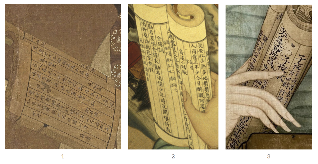 图十五 仕女手中的书卷1.《闺秀诗评图》 2.《美人展书图》 3.《春闺倦读图》