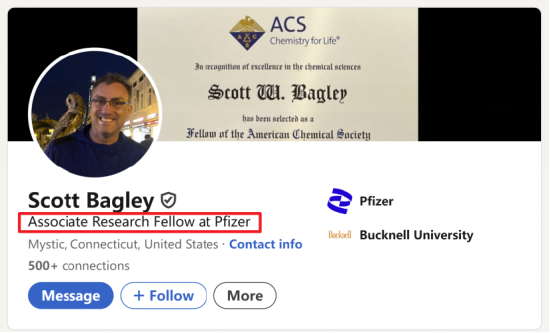四位审稿人里,有两位署了名:Scott Bagley和Wesley Pein,他们一位是辉瑞制药的研发负责人,一位是辉瑞的高级科学家: