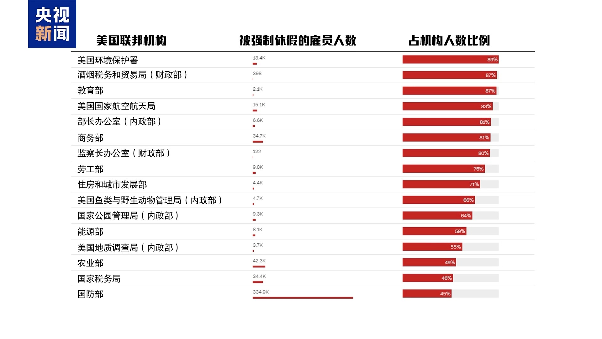 从人数来看,美国国防部被强制休假的人数超过33万人,占该部门雇员总数的近一半;农业部强制休假人数超过4万人;商务部和国家税务局强制休假人数均超过了3万人。