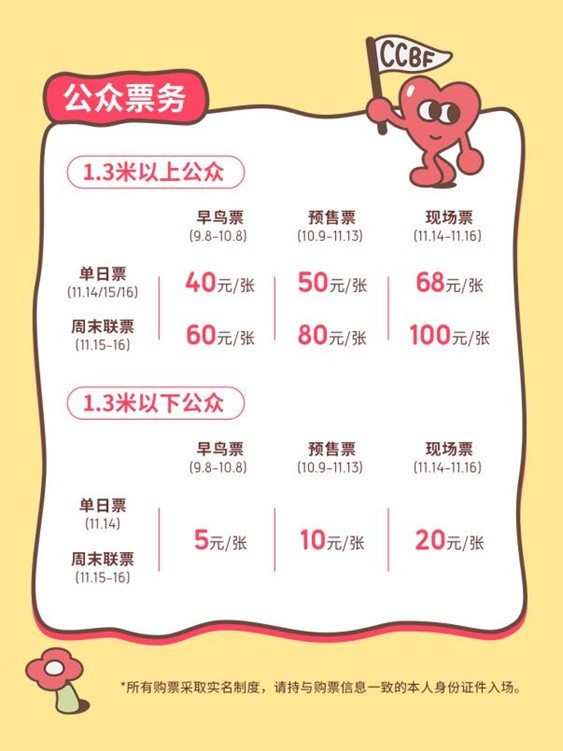 公众票由猫眼平台独家发售,提前购买享预售优惠(成人50元/单日票、80元/周末联票,1.3米以下儿童10元/票),现场购票成人68元/单日票、100元/周末联票,儿童20元/票,纪念套票预售价80元(成人)、40元(儿童),预售截至11月13日16:00。11月14-16 日,版权区仅对专业观众开放,综合区面向所有观众开放。