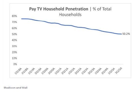 据科技/媒体咨询公司Madison and Wall估计,到2025年底,仍订阅有线电视服务的美国家庭比例将首次跌破50%,而15年前,这一比例高达近90%。