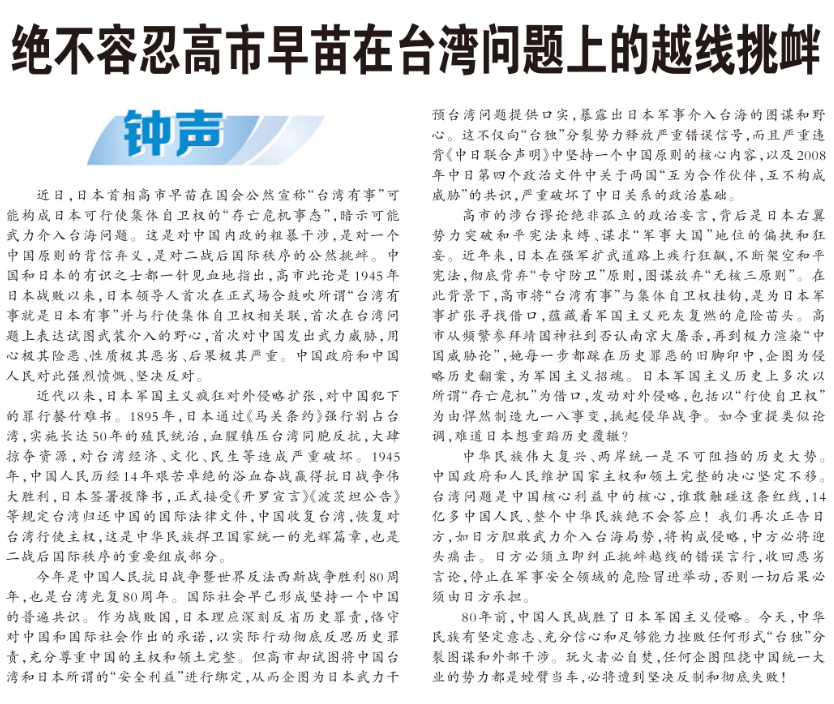 11月14日出版的《人民日报》发表“钟声”署名评论《绝不容忍高市早苗在台湾问题上的越线挑衅》,直接点名高市早苗荒唐言论的本质:高市的涉台谬论绝非孤立的政治妄言,背后是日本右翼势力突破和平宪法束缚、谋求“军事大国”地位的偏执和狂妄。