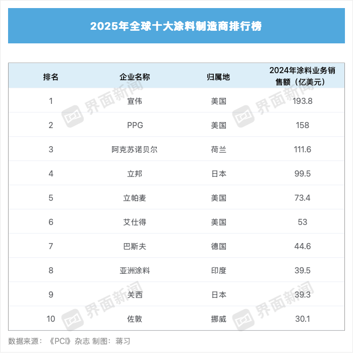 根据美国《PCI》杂志发布的2025年全球十大涂料企业榜单,阿克苏诺贝尔以销售额111.6亿美元位列第三,艾仕得以52.8亿美元的销售额排名第六。该排名基于2024年涂料销售收入,其他非涂料产品的销售收入不包括在内。