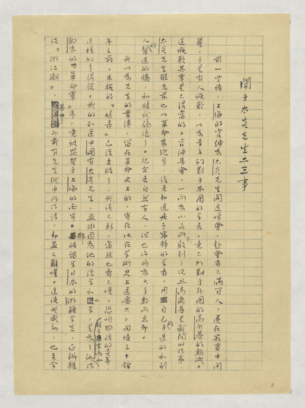 太炎先生虽先前也以革命家现身,后来却退居于宁静的学者,用自己所手造的和别人所帮造的墙,和时代隔绝了。纪念者自然有人,但也许将为大多数所忘却。