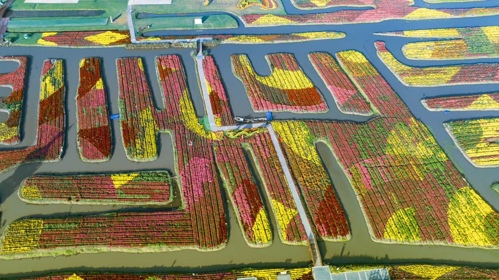 在千垛景区,站在高处的观景台上,记者看到了一幅“五彩的秋日”。各色菊花在垛格上层层铺展,金丝皇菊灿烂如阳光碎片,国庆小菊热烈似燃烧的云霞,它们与碧水相映,像一幅流动的织锦;远处飘来蒸蟹的香气,与淡雅的菊香交织,构成独属于水乡秋日的浪漫交响。