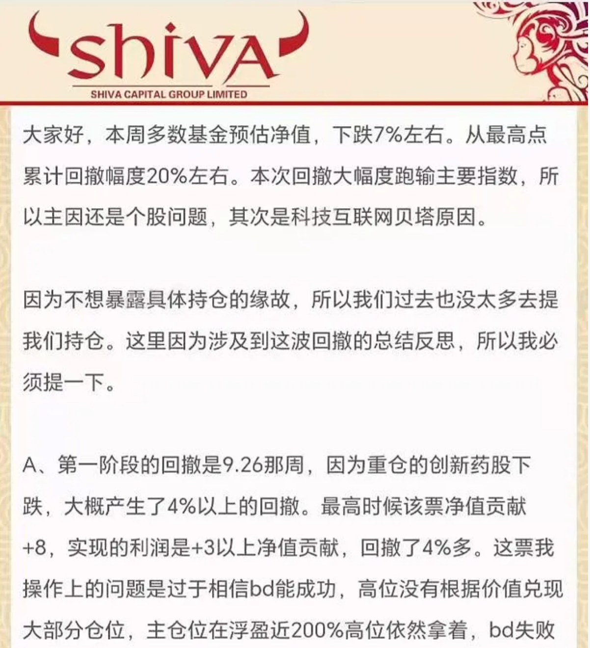 希瓦私募最新发布的周报显示,旗下多数基金单周下跌7%左右,从最高点累计回撤幅度约20%,本次回撤大幅跑输主要指数。