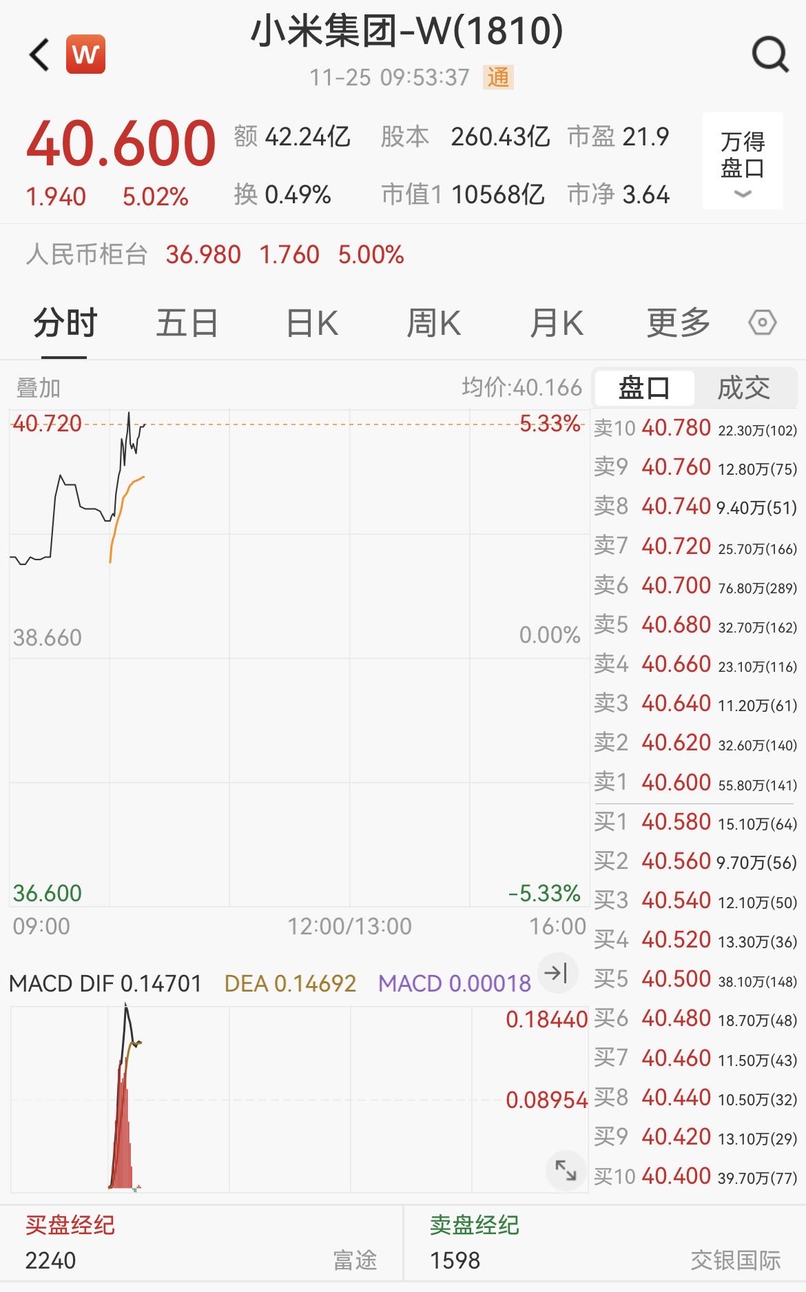 11月25日,小米集团(01810.HK)港股迎来强势反弹,股价高开高走。截至上午9时53分,小米股价报40.6港元/股,大幅上涨5.02%,公司总市值随之攀升至10568亿港元,重回万亿港元大关,一扫近期股价持续走低的阴霾。
