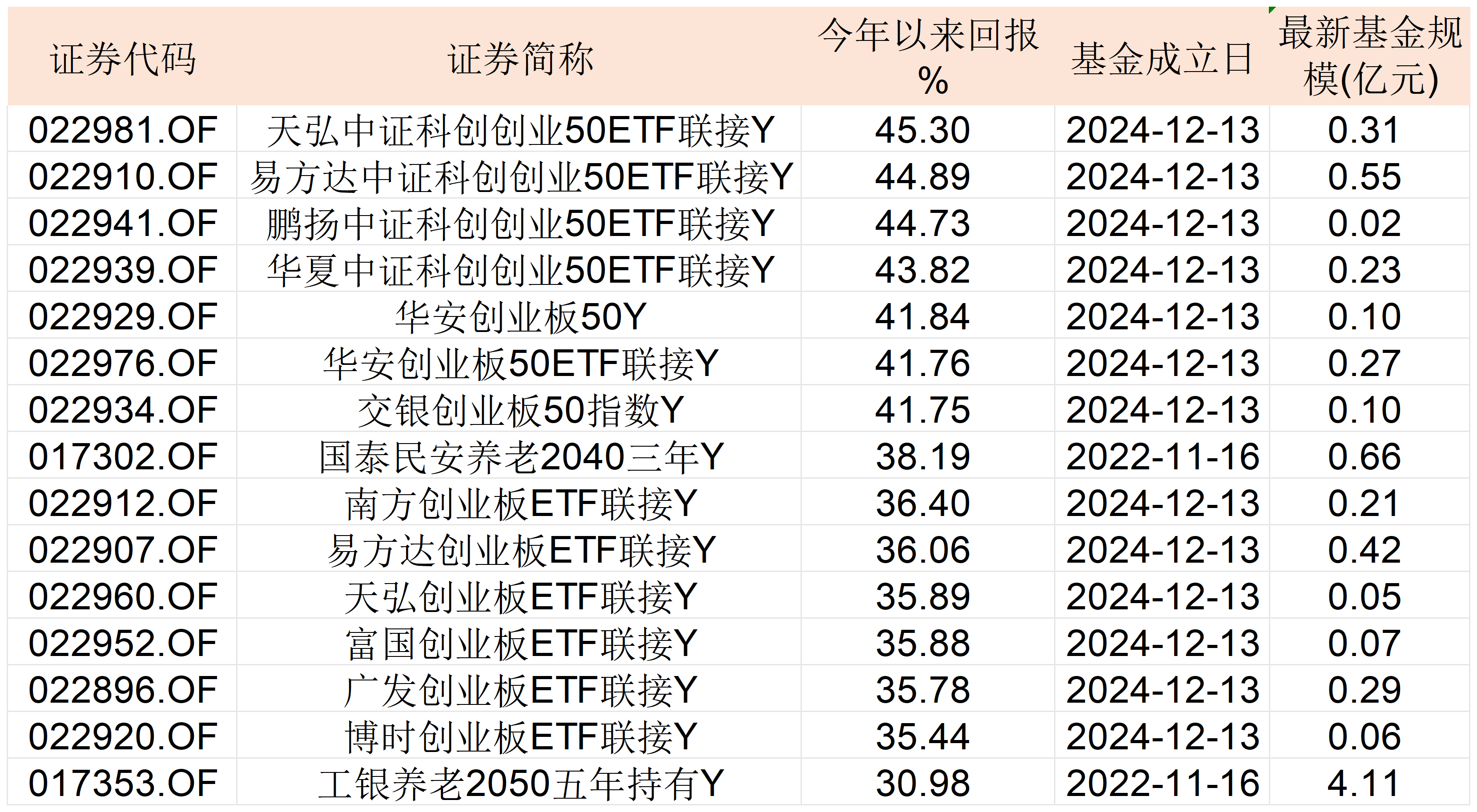 今年以来,指数型Y份额基金业绩遥遥领先,有13只收益率超30%,4只科创创业50ETF联接Y份额今年以来收益率更是超过40%。传统的养老目标基金和养老日期基金也取得了不错的收益率。工银养老2050五年持有Y、易方达养老目标日期2050五年持有Y、易方达养老目标日期2055五年持有Y、鹏华养老2045三年Y、易方达养老目标日期2045五年持有Y等产品回报率也超过了20%。