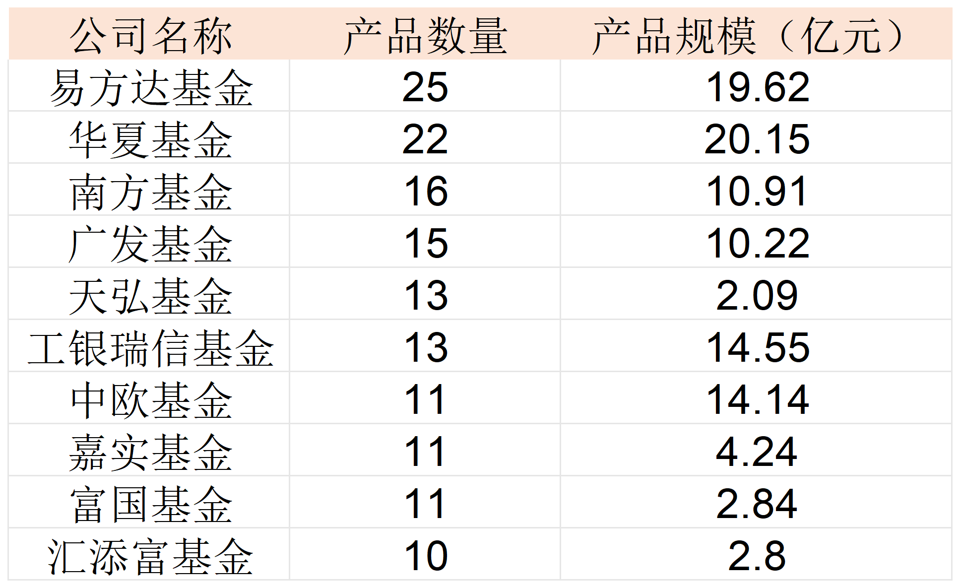 从产品规模来看,虽然Y份额基金的单只规模并不大,但公募通过产品矩阵在努力布局。其中,产品数量前十的分别为易方达基金、华夏基金、南方基金、广发基金、天弘基金、工银瑞信基金、中欧基金、嘉实基金、富国基金和汇添富基金。