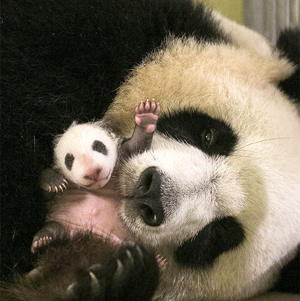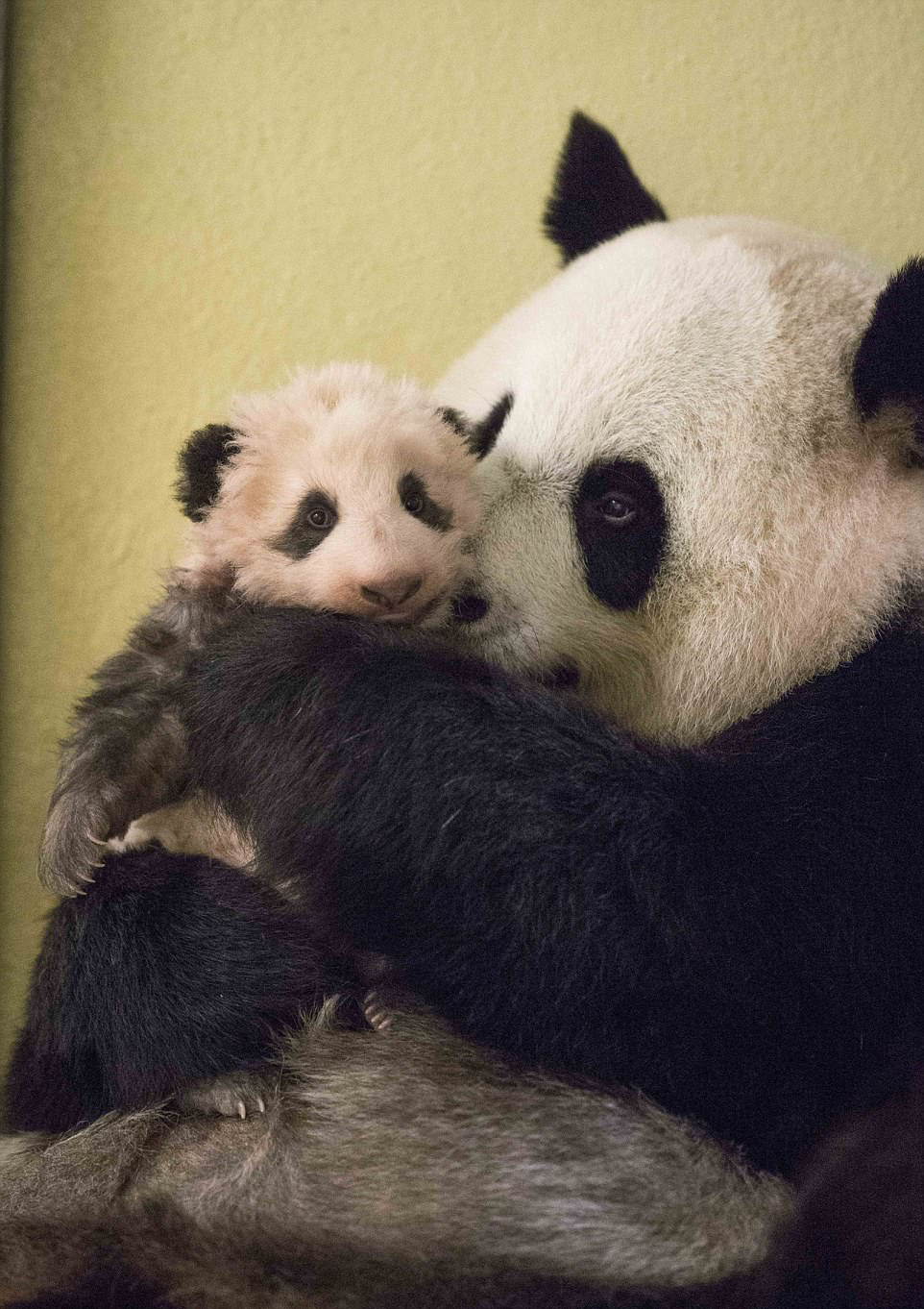 2017年8月6日,法国博瓦勒动物园,“欢欢”和刚出生2天的“圆梦”。
