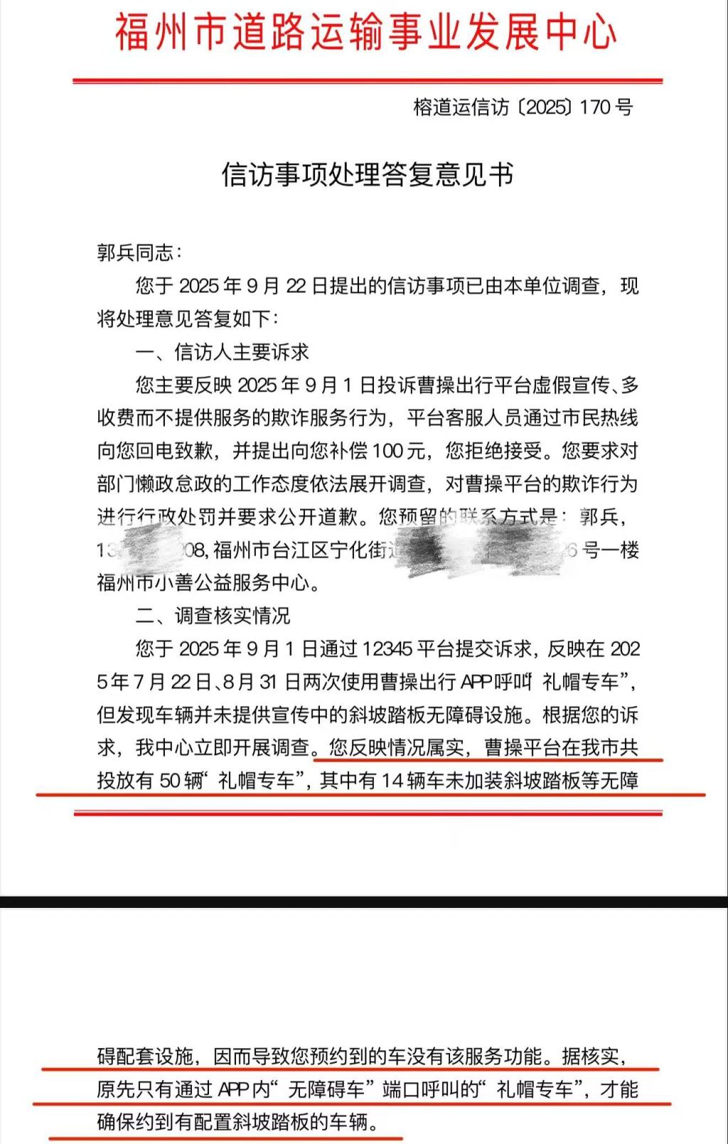 经过近两个月的等待,11月14日,福州市道路运输事业发展中心出具《信访事项处理答复意见书》,正式核实了郭兵反映的“礼帽”专车未提供宣传中的斜坡踏板等无障碍设施的情况。答复意见书中称:“曹操平台在我市(福州市)共投放有50辆‘礼帽’专车,其中14辆车未加装斜坡踏板等无障碍配套设施,因而导致您预约到的车辆不具备该服务功能。据核实,原先仅通过APP内‘无障碍车’端口呼叫的‘礼帽’专车,才能确保约到配置斜坡踏板的车辆。”