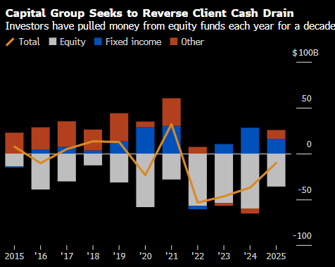 由于投资者已开始远离长期以来帮助Capital Group成功的共同基金,对于2023年开始掌舵的Gitlin来说,当前的转型可谓事关重大。过去10年的每一年,该公司的股票共同基金和相关产品都遭遇了客户资金的净流出。固定收益和退休产品以及新ETF的资金流入开始缓和资金外流的局面。